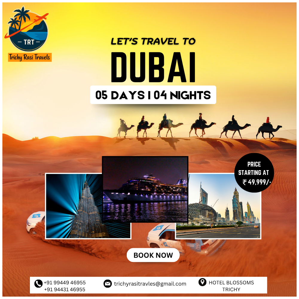 Experience the magic of Dubai with Trichy Rasi Travels’ Best Dubai Tour Package from Trichy, starting at just ₹49, 999 for 5 Days and 4 Nights. Discover the city’s top attractions including the Burj Khalifa, Desert Safari, Dhow Cruise Dinner, Dubai City Tour, and world-famous shopping spots. Our all-inclusive package covers flights, hotel stay, transfers, visa assistance, and guided tours — making your Dubai holiday smooth and memorable. Book your Dubai tour from Trichy today with Trichy Rasi Travels, your trusted travel partner for affordable international vacations.