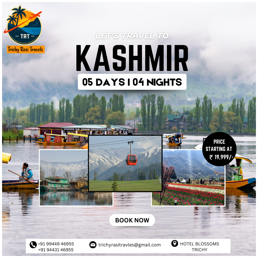 Duration: 5 Days / 4 Nights Price: Rs 19, 999 per person Destinations Covered: Srinagar – Gulmarg – Pahalgam – Sonamarg Overview Experience the breathtaking beauty of Kashmir with Trichy Rasi Travels. This 5-day tour from Thanjavur covers the most popular destinations in Kashmir including Srinagar, Gulmarg, Pahalgam, and Sonamarg. Enjoy houseboat stays, shikara rides, snow-capped mountains, and serene valleys. Ideal for families, couples, and group travelers looking for a refreshing getaway. Tour Highlights Shikara ride on Dal Lake Visit Gulmarg – cable car ride and snow activities Explore Pahalgam – scenic landscapes and Betaab Valley Visit Sonamarg – glaciers and mountain views Stay in comfortable hotels and houseboats All transfers and sightseeing included Sample Itinerary Day 1 – Arrival at Srinagar. Check-in at hotel or houseboat. Evening Shikara ride on Dal Lake. Overnight in Srinagar. Day 2 – Full day excursion to Gulmarg. Enjoy cable car ride and snow activities. Overnight in Gulmarg/Srinagar. Day 3 – Drive to Pahalgam. Visit Betaab Valley, Aru and Lidder River. Overnight in Pahalgam/Srinagar. Day 4 – Excursion to Sonamarg. Explore glaciers and enjoy scenic views. Return to Srinagar. Overnight stay. Day 5 – Local sightseeing in Srinagar – Mughal Gardens, local markets. Departure back to Thanjavur. Inclusions 4 nights hotel or houseboat stay with breakfast All transfers and sightseeing by private vehicle Professional guide assistance Entry fees to attractions included Shikara ride on Dal Lake About Trichy Rasi Travels Trichy Rasi Travels is a trusted travel company in Trichy, providing domestic and international holiday packages. We arrange comfortable transportation, verified hotels, guided tours, and memorable experiences for customers from Thanjavur, Trichy, and nearby areas.