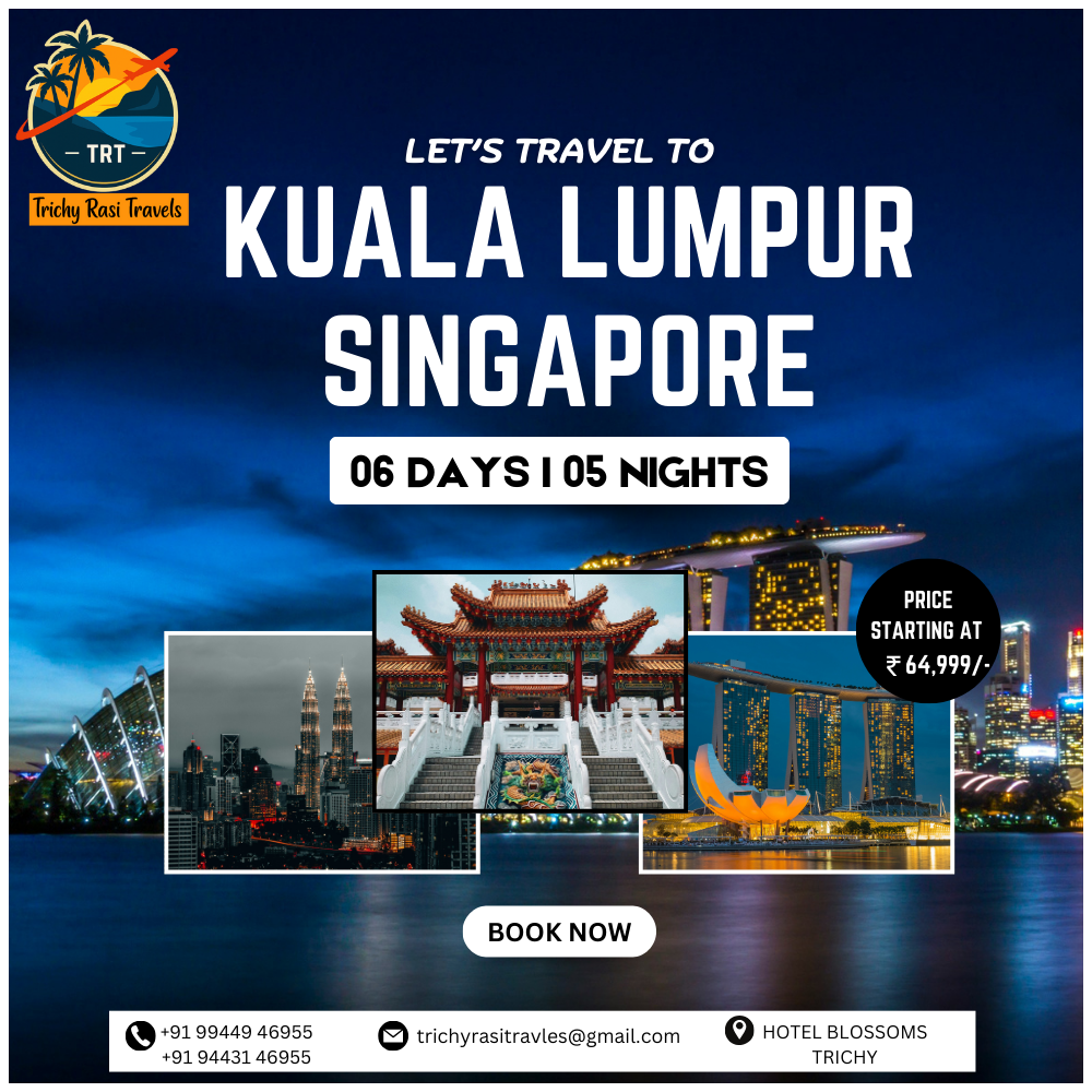 Duration: 6 Days / 5 Nights Price: Rs 64, 999 per person Destinations Covered: Singapore and Kuala Lumpur Overview Travel with Trichy Rasi Travels on an exciting Singapore and Kuala Lumpur tour package from Thanjavur. Explore the vibrant city life, family attractions, modern architecture, shopping hubs, and world-class entertainment. This 6-day international holiday is perfect for families, couples, and groups who want a mix of fun, culture, and relaxation. Tour Highlights Guided city tour of Singapore – Marina Bay Sands, Merlion Park, Gardens by the Bay Thrilling day at Sentosa Island – Universal Studios, Sky Ride, Madame Tussauds Visit Singapore Night Safari – world-famous wildlife attraction Kuala Lumpur city tour – Petronas Twin Towers, King’s Palace, Batu Caves Shopping at Bukit Bintang and Chinatown Comfortable hotels with daily breakfast Return airfare and transfers included Sample Itinerary Day 1 – Departure from Thanjavur to Singapore. Arrival, transfer to hotel, evening leisure. Overnight in Singapore. Day 2 – Singapore city tour covering Merlion Park, Marina Bay, Orchard Road, Chinatown. Evening visit to Gardens by the Bay. Overnight in Singapore. Day 3 – Full day at Sentosa Island including Universal Studios and attractions. Overnight in Singapore. Day 4 – Morning free. Afternoon travel to Kuala Lumpur. Evening city orientation tour. Overnight in Kuala Lumpur. Day 5 – Kuala Lumpur sightseeing – Petronas Twin Towers, Batu Caves, King’s Palace, Independence Square. Evening shopping at Bukit Bintang. Overnight in Kuala Lumpur. Day 6 – Free time for shopping and leisure. Departure from Kuala Lumpur to Thanjavur. Inclusions Return flight tickets from Thanjavur/Trichy sector 3 nights stay in Singapore and 2 nights stay in Kuala Lumpur Daily breakfast at hotels Sightseeing tours with transfers Entry tickets to Universal Studios, Sentosa, and major attractions Visa assistance for Singapore and Malaysia Professional tour manager support About Trichy Rasi Travels Trichy Rasi Travels is a trusted travel company based in Trichy. We provide a wide range of international holiday packages including Singapore, Malaysia, Dubai, Bali, and more. With years of service experience, we ensure comfortable travel, quality hotels, and competitive prices for customers from Thanjavur, Trichy, and nearby cities.