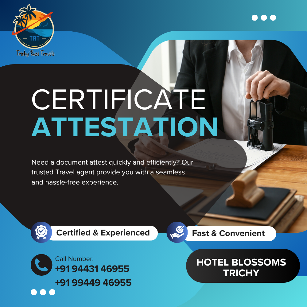 Simplify your documentation process with Certificate Attestation Services in Coimbatore by Trichy Rasi Travels. We specialize in attestation of educational, personal, and commercial documents required for overseas employment, study, or migration. Our experts coordinate with HRD, MEA, and Embassy authorities to ensure legal and verified attestation. We guarantee a safe, transparent, and timely process, helping you complete your formalities without stress. Choose Trichy Rasi Travels — Coimbatore’s most trusted partner for reliable certificate attestation services.