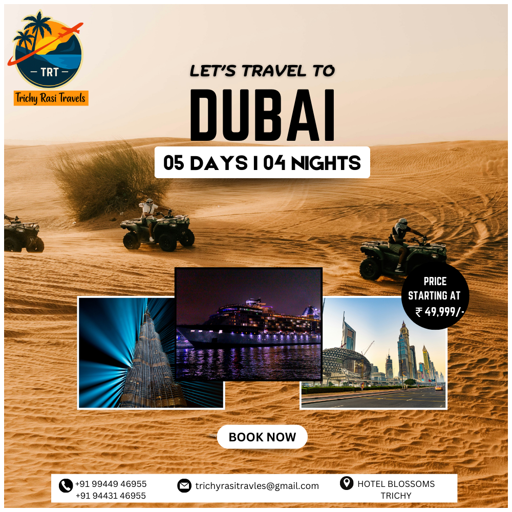 Dubai Tour Package from MaduraiStep into luxury with our Dubai Tour Package from Madurai, crafted by Trichy Rasi Travels. Visit Burj Khalifa, enjoy a desert safari, cruise along Dubai Marina, and shop in grand malls. Our all-inclusive package covers visa, transfers, hotel stay, and sightseeing — giving you a complete Dubai experience.