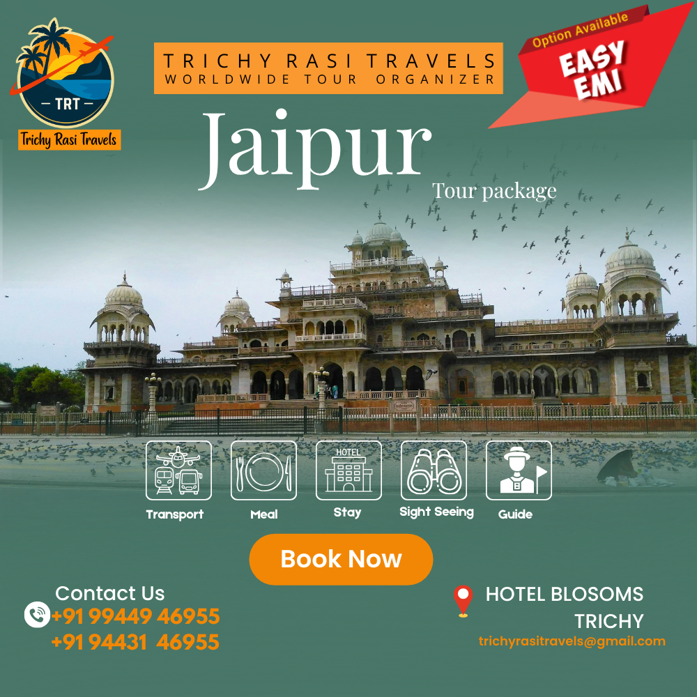 Experience the royal charm of Rajasthan with our Jaipur Tour Package from Trichy Rasi Travels. Known as the Pink City, Jaipur welcomes you with majestic forts, colorful markets, and rich traditions. Discover the royal heritage, architectural wonders, and warm hospitality that make Jaipur one of India’s most loved travel destinations. Highlights Visit the magnificent Amber Fort and Nahargarh Fort Explore the City Palace and Jantar Mantar Stop by the iconic Hawa Mahal and Jal Mahal Enjoy shopping at Johari Bazaar and Bapu Bazaar Experience Rajasthani culture, traditional music, and local cuisine Package Includes Comfortable hotel accommodation Daily breakfast Private air conditioned transfers Sightseeing tours as per itinerary All tolls, parking and driver allowances Departure from Trichy Duration 3 Days and 2 Nights Book your Jaipur tour with Trichy Rasi Travels and enjoy a royal journey filled with history, color, and culture. About Trichy Rasi Travels Trichy Rasi Travels is a trusted travel agency based in Trichy, offering a wide range of domestic and international tour packages. We specialize in family holidays, honeymoon trips, group tours, and customized travel plans to suit every budget and preference. Our goal is to make every journey comfortable, safe, and memorable. With years of experience and a dedicated team, we ensure hassle free travel from start to finish. Trichy Rasi Travels – Your Journey Begins Here