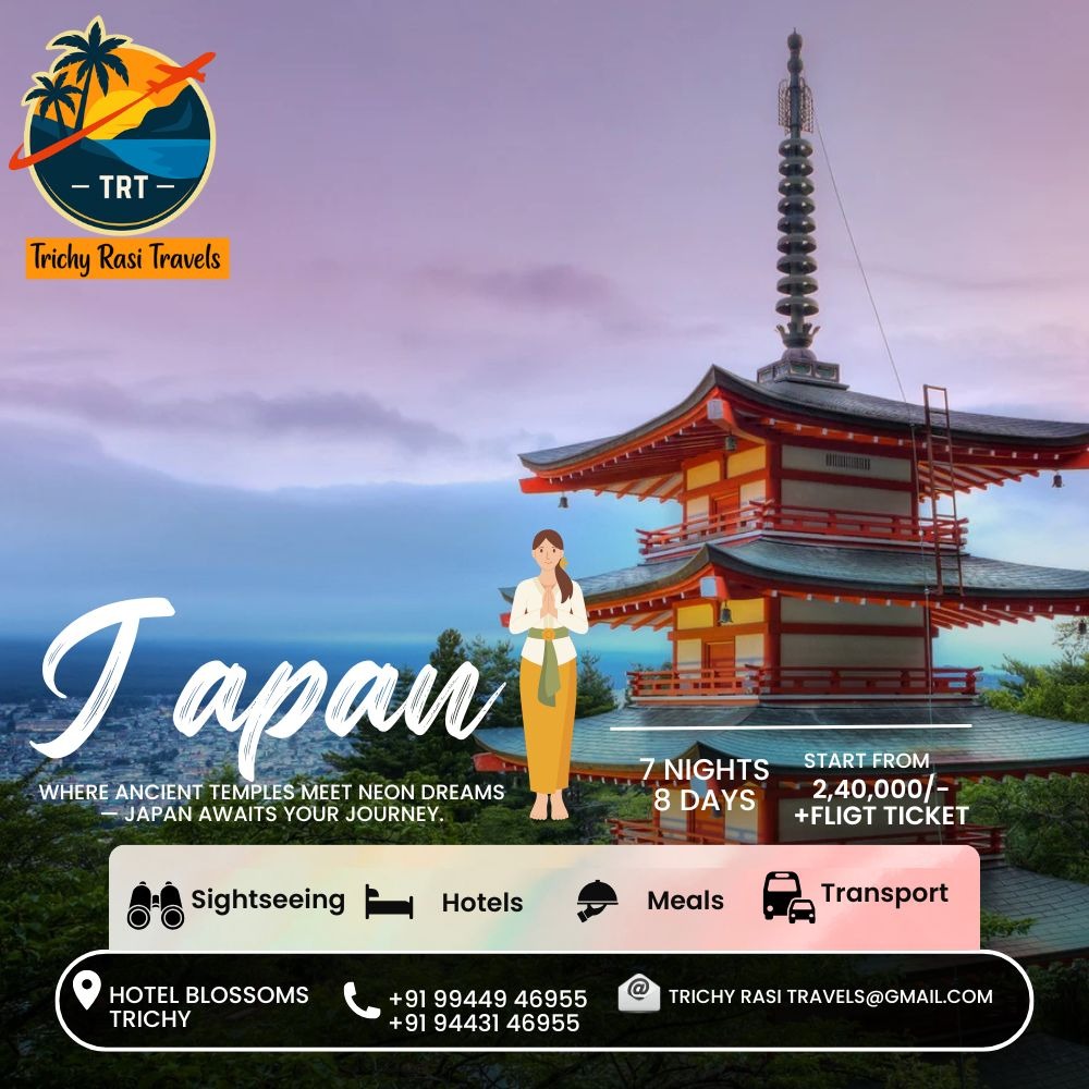 Japan Tour Package from CoimbatoreExperience the perfect blend of tradition and technology with our Japan Tour Package from Coimbatore. Visit Tokyo, Kyoto, and Osaka, explore cherry blossoms, and enjoy authentic Japanese culture. Trichy Rasi Travels provides seamless arrangements and guided tours for an unforgettable Far-East journey.