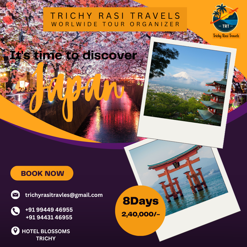 Discover tradition and technology in harmony with our Japan Tour Package from Trichy, organized by Trichy Rasi Travels. Explore Tokyo’s futuristic skyline, Kyoto’s ancient temples, and the natural beauty of Mount Fuji. Experience Japan’s rich culture, punctual lifestyle, and warm hospitality — all in one unforgettable journey. With expert planning and seamless coordination, your Japan adventure will be a perfect blend of comfort and cultural discovery.