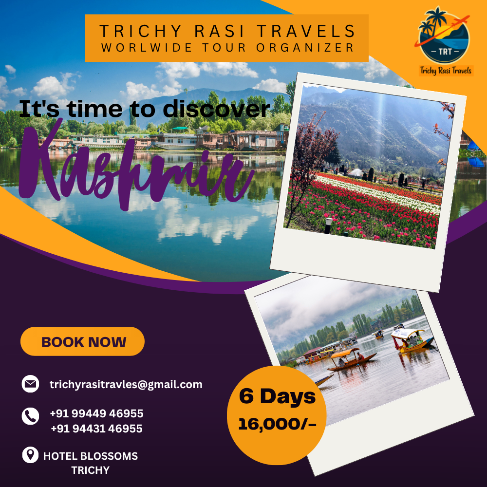 Experience heaven on earth with our Best Kashmir Tour Package from Trichy by Trichy Rasi Travels. Discover the breathtaking beauty of Srinagar, Gulmarg, and Pahalgam as you glide through the serene Dal Lake in a Shikara and admire the snow-clad Himalayas. Perfect for honeymooners and families, our Kashmir packages include comfortable stays, guided sightseeing, and smooth travel arrangements. Let Trichy Rasi Travels make your Kashmir dream come true with a journey filled with peace, charm, and unforgettable memories.