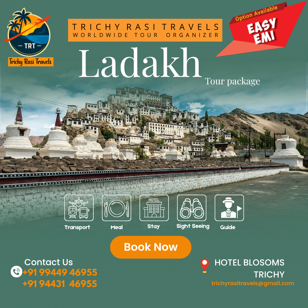 Embark on an unforgettable journey to the land of high passes and breathtaking landscapes with our Ladakh Tour Package from Trichy Rasi Travels. Known for its dramatic mountains, serene lakes, and unique culture, Ladakh is a perfect destination for adventure lovers, nature enthusiasts, and travelers seeking tranquility. Highlights Explore the stunning Pangong Lake and Tso Moriri Lake Visit the historic monasteries of Hemis, Thiksey, and Shey Experience the charm of Leh Market and local culture Drive through Khardung La Pass, one of the highest motorable roads in the world Enjoy adventure activities like river rafting and trekking Package Includes Comfortable hotel and guesthouse accommodation Daily breakfast Private air conditioned transfers Sightseeing tours as per itinerary All tolls, parking and driver allowances Departure from Trichy Duration 7 Days and 6 Nights Book your Ladakh tour with Trichy Rasi Travels and witness the surreal beauty and unique culture of this Himalayan paradise. About Trichy Rasi Travels Trichy Rasi Travels is a trusted travel agency based in Trichy, offering a wide range of domestic and international tour packages. We specialize in family holidays, honeymoon trips, group tours, and customized travel plans to suit every budget and preference. Our goal is to make every journey comfortable, safe, and memorable. With years of experience and a dedicated team, we ensure hassle free travel from start to finish. Trichy Rasi Travels – Your Journey Begins Here