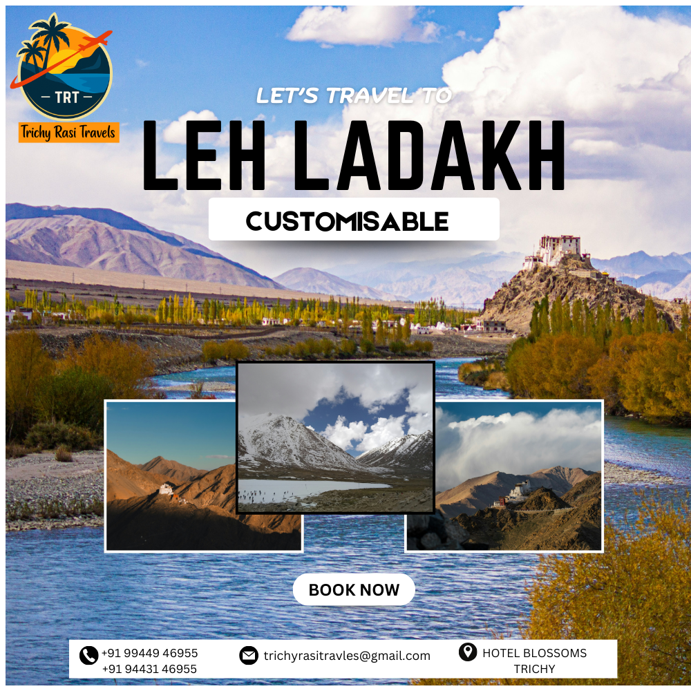 Duration: Flexible (Based on your choice) Price: Starting from Rs (depends on itinerary) Destinations Covered: Leh, Nubra Valley, Pangong Lake, Tso Moriri, Magnetic Hill, Khardung La Overview Explore the breathtaking landscapes of Leh and Ladakh with Trichy Rasi Travels’ Customisable Tour Package. This package is fully flexible, allowing you to select the number of days, destinations, and type of travel. From high mountain passes to pristine lakes and monasteries, experience the adventure, culture, and serenity of Ladakh at your own pace. Highlights Visit Leh Palace, Shanti Stupa, and local monasteries Explore Nubra Valley – sand dunes, monasteries, and scenic villages Visit Pangong Lake and Tso Moriri Lake – famous for stunning landscapes Drive through Khardung La – one of the highest motorable passes in the world Experience Magnetic Hill and local markets Adventure activities (optional) – river rafting, biking, trekking Customisable hotel and stay options – from standard to luxury Sample Itinerary (Flexible) Day 1 – Arrival at Leh. Acclimatization and local sightseeing. Overnight in Leh. Day 2 – Leh to Nubra Valley via Khardung La. Explore sand dunes and monasteries. Overnight in Nubra Valley. Day 3 – Nubra Valley to Pangong Lake. Enjoy the lake and surrounding scenery. Overnight near Pangong. Day 4 – Pangong Lake to Leh. Visit Magnetic Hill and local markets. Overnight in Leh. Day 5 – Optional excursion to Tso Moriri Lake or rest day in Leh. Overnight in Leh. Day 6 – Departure from Leh. Itinerary can be fully customised according to your preferred days, budget, and destinations. Inclusions Accommodation as per selected category (hotel, guest house, or homestay) Private vehicle with experienced driver for all transfers Local sightseeing as per customised itinerary Guide assistance if required All permits for restricted areas (Leh, Nubra, Pangong, Tso Moriri) Why Choose Trichy Rasi Travels Trichy Rasi Travels is a trusted travel company based in Trichy, providing customised domestic and international tours. Our Leh Ladakh packages are flexible, allowing travelers from Thanjavur, Trichy, and nearby areas to design their own adventure. We ensure safe travel, comfortable stays, and a memorable Ladakh experience.