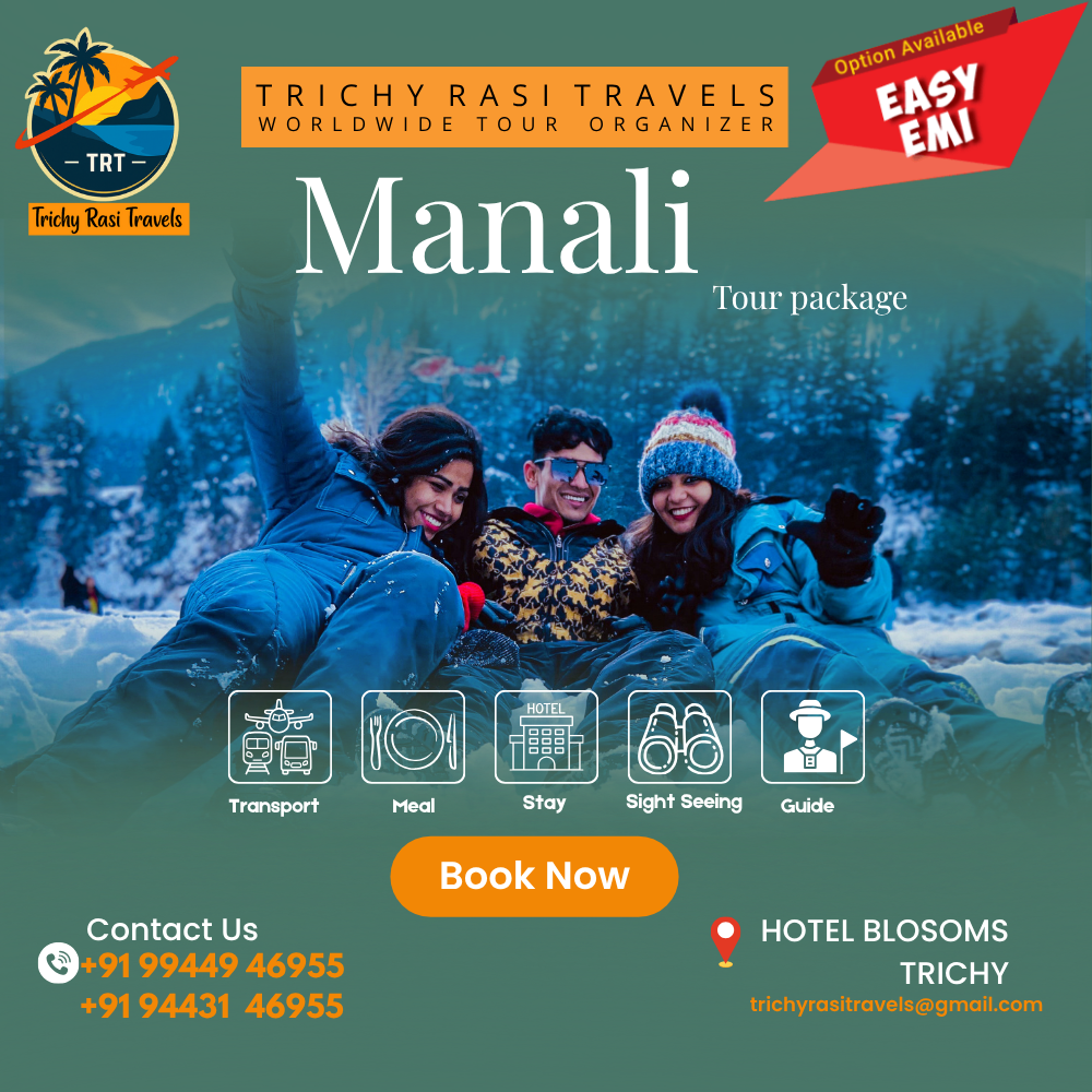 Experience the adventure and beauty of the Himalayas with our Manali Tour Package from Trichy Rasi Travels. Nestled in the Kullu Valley of Himachal Pradesh, Manali offers snow capped mountains, lush landscapes, and exciting activities for travelers of all kinds. Perfect for families, honeymooners, and adventure enthusiasts, this trip promises an unforgettable hill station experience. Highlights Explore Solang Valley for adventure activities like paragliding, zorbing, and skiing Visit Rohtang Pass for breathtaking snow covered views Stroll through Mall Road and enjoy local shopping and cuisine Discover Hidimba Temple and Manu Temple Experience scenic river views and nature walks in Old Manali Package Includes Comfortable hotel accommodation Daily breakfast Private air conditioned transfers Sightseeing tours as per itinerary All tolls, parking and driver allowances Departure from Trichy Duration 5 Days and 4 Nights Book your Manali tour with Trichy Rasi Travels and enjoy a perfect mix of adventure, nature, and relaxation in the Himalayas. About Trichy Rasi Travels Trichy Rasi Travels is a trusted travel agency based in Trichy, offering a wide range of domestic and international tour packages. We specialize in family holidays, honeymoon trips, group tours, and customized travel plans to suit every budget and preference. Our goal is to make every journey comfortable, safe, and memorable. With years of experience and a dedicated team, we ensure hassle free travel from start to finish. Trichy Rasi Travels – Your Journey Begins Here