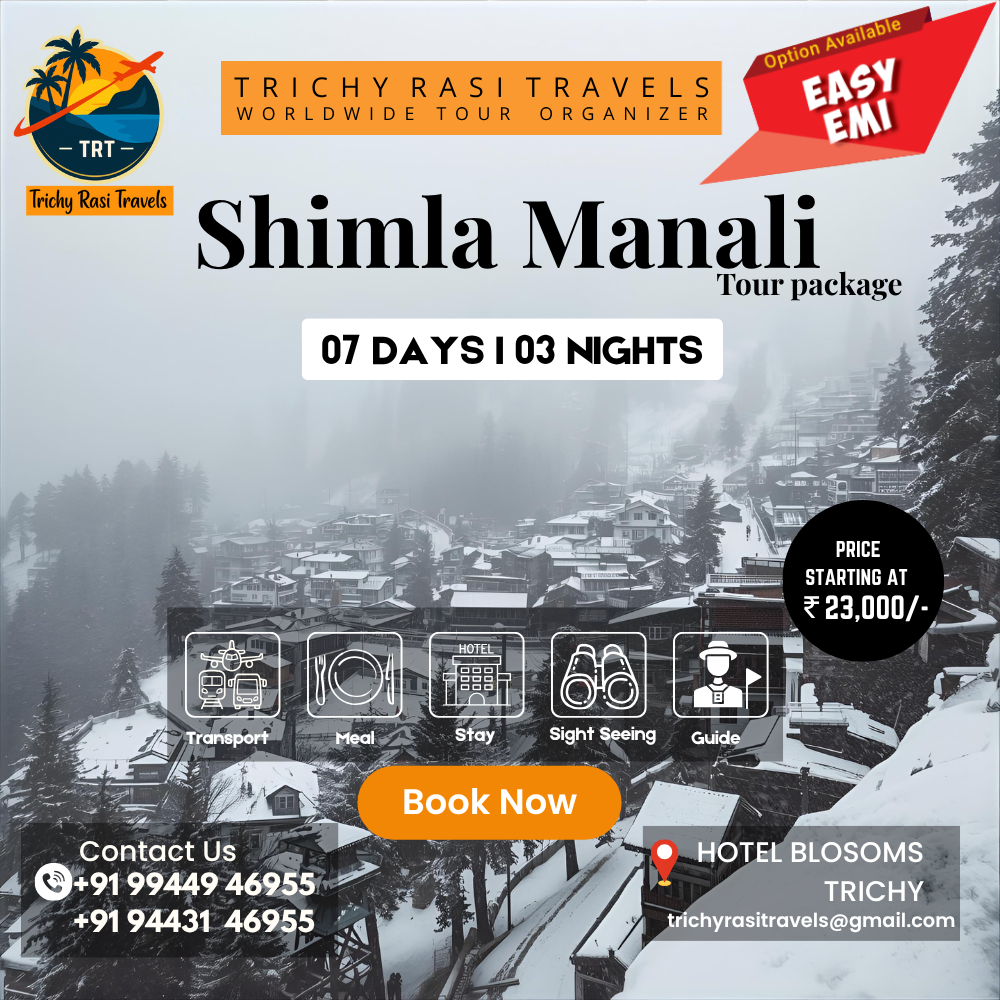 Duration: 7 Days / 6 Nights Price: ₹23, 000 Per Person Discover the scenic beauty of Himachal with Trichy Rasi Travels’ Shimla Manali Tour Package from Trichy. Explore snow-capped mountains, Kufri, Solang Valley, and Rohtang Pass while enjoying a cool climate, adventure activities, and stunning landscapes. Perfect for families and honeymooners — we ensure smooth travel, cozy stays, and joyful sightseeing.
