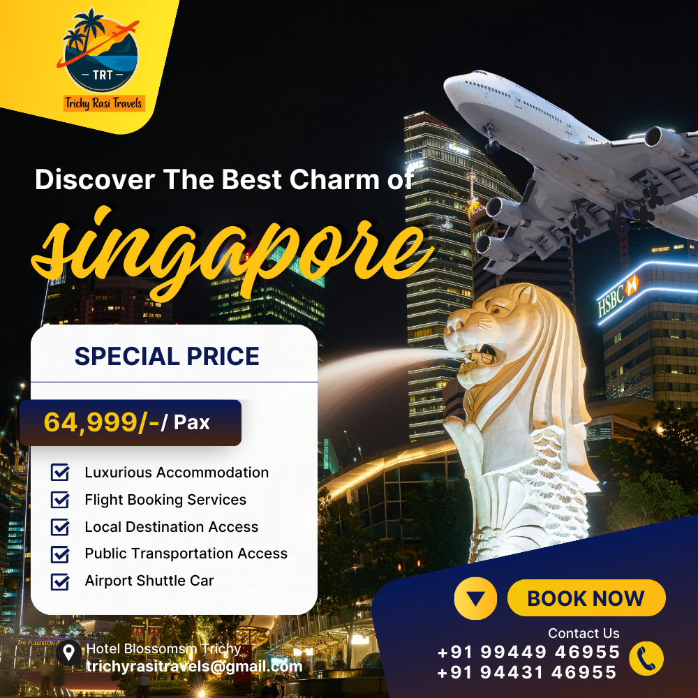 Discover the best charm of Singapore with a perfect mix of modern attractions, cultural heritage, and world class entertainment This package is designed for families, couples, and groups to enjoy a hassle free holiday Tour Highlights Visit Marina Bay Sands and Gardens by the Bay Explore Sentosa Island and Universal Studios Merlion Park and Singapore Flyer Night Safari and Jurong Bird Park Orchard Road Shopping Experience Little India and Chinatown cultural walk Price 64999 per person Package Inclusions Luxurious Accommodation Flight Booking Services Local Destination Access Public Transportation Access Airport Shuttle Car Departure From Trichy Organized by Trichy Rasi Travels Email trichyrasitravels@gmail.com Contact 91 99449 46955 91 94431 46955 Book now and explore the beauty of Singapore with Trichy Rasi Travels