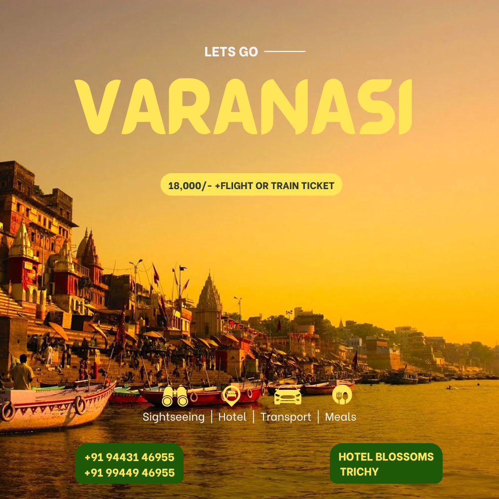 Varanasi Tour Organized by Trichy Rasi Travels with over 25 plus years of trusted travel service Experience the spiritual essence of Varanasi the oldest living city in the world. Witness the famous Ganga Aarti explore sacred temples and soak in the cultural beauty of this holy city. A perfect trip for couples families and friends seeking peace devotion and heritage Tour Highlights Visit to Kashi Vishwanath Temple Ganga Aarti at Dashashwamedh Ghat Boat ride on the Ganga River Local sightseeing including Sarnath Comfortable accommodation and travel support Customised itinerary available on request Tour cost details are available at our office Flight or train ticket fare is not included For bookings and information visit our office at Blossoms Hotel Trichy Let Trichy Rasi Travels take you on a meaningful and well guided spiritual journey